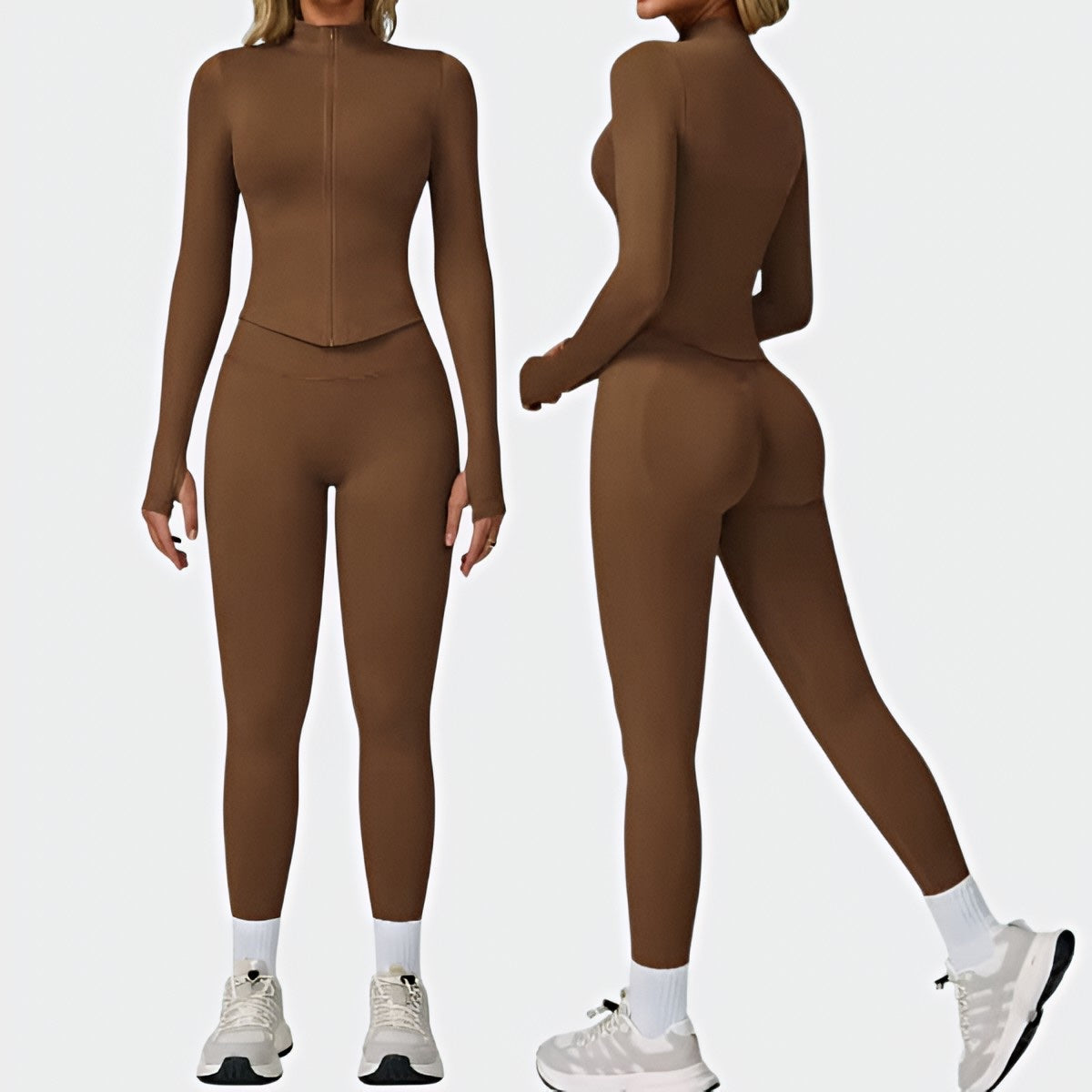 Este set de moda athleisure incluye una cómoda chaqueta con puños antideslizantes y un legging push up en V perfecto para un estilo casual y activo. Confeccionado con materiales de alta calidad para una durabilidad duradera. ¡Añade un toque deportivo y moderno a tu guardarropa!