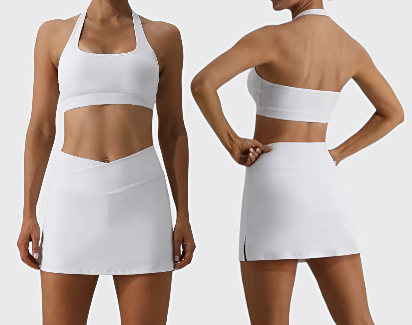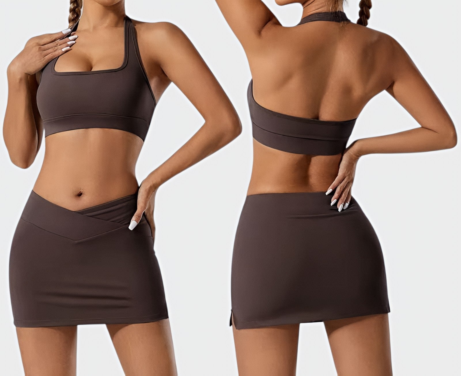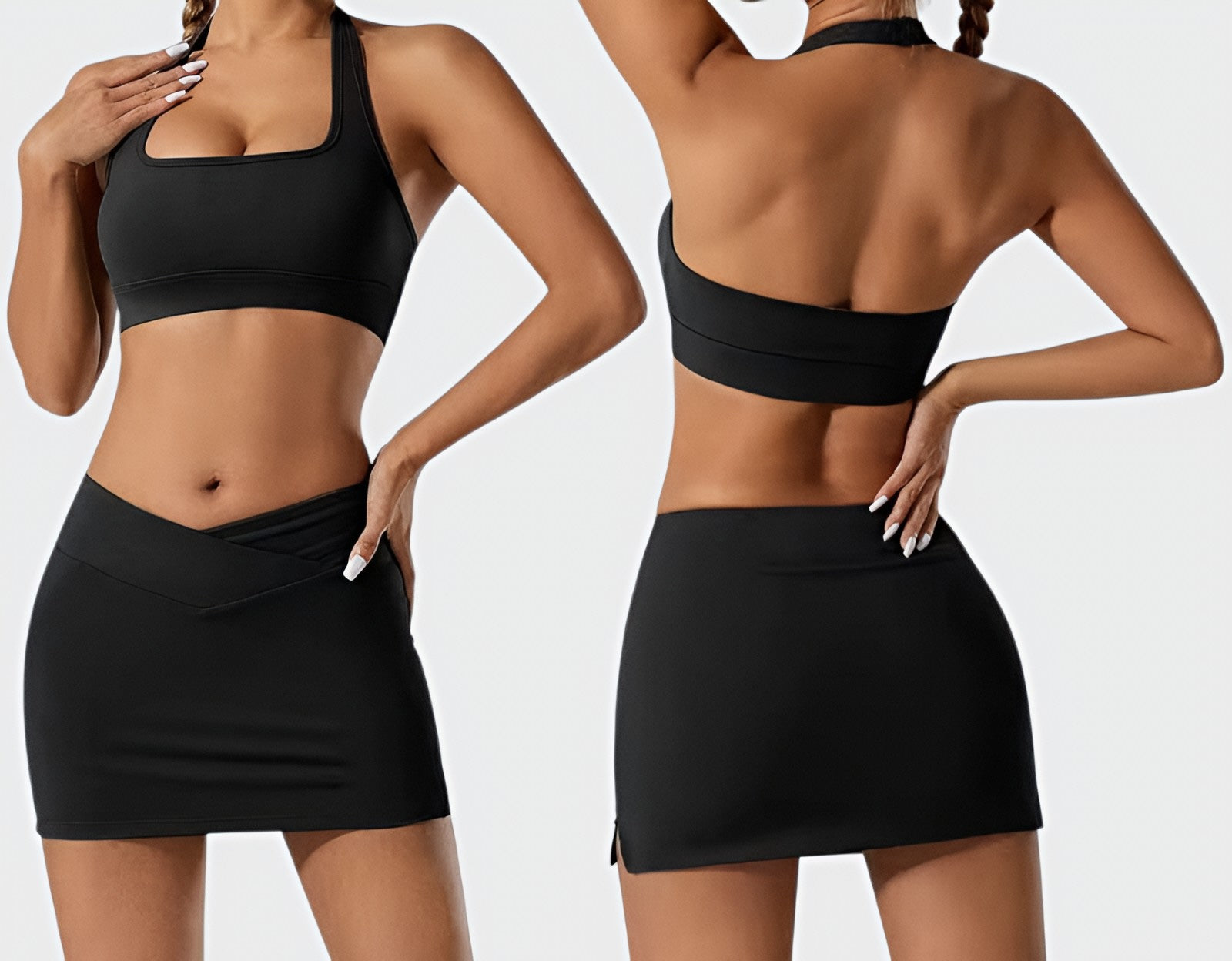Este set incluye un top con espalda descubierta que te brindan comodidad y sujeción mientras te mueves. Complementando tu look, la falda short cuenta con un short interno que asegura tu comodidad y libertad de movimiento, además de un toque único en sus laterales que le añade estilo. Perfecto para cada sesión de ejercicio, este conjunto es la elección perfecta para lucir bien y sentirte aún mejor.