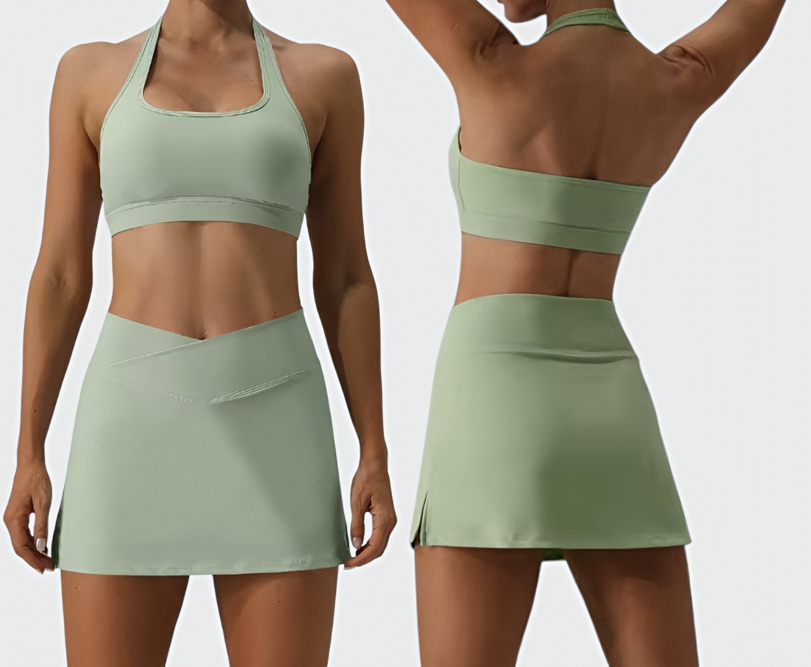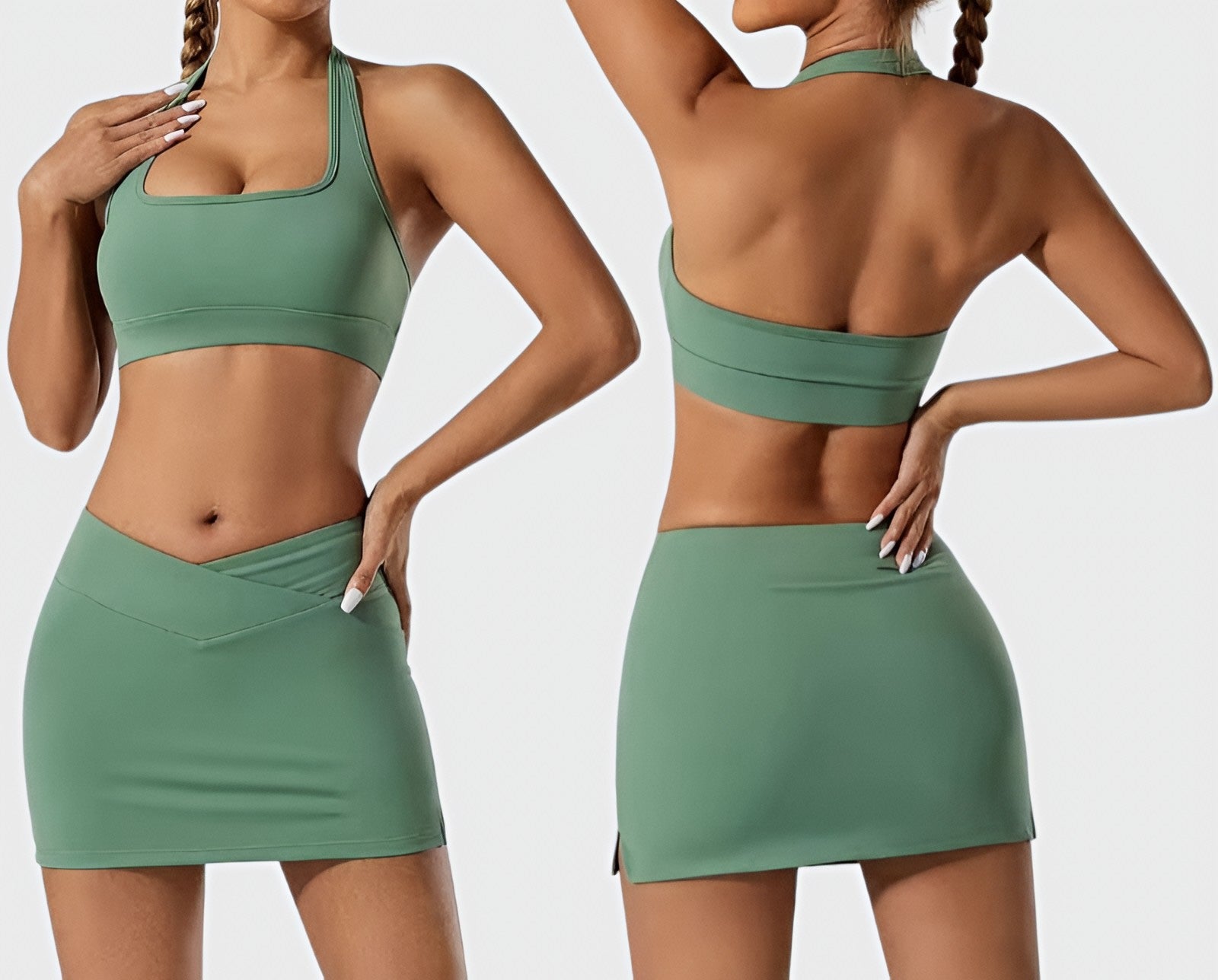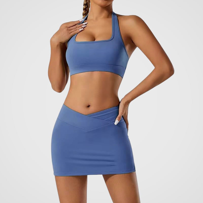 Este set incluye un top con espalda descubierta que te brindan comodidad y sujeción mientras te mueves. Complementando tu look, la falda short cuenta con un short interno que asegura tu comodidad y libertad de movimiento, además de un toque único en sus laterales que le añade estilo. Perfecto para cada sesión de ejercicio, este conjunto es la elección perfecta para lucir bien y sentirte aún mejor.