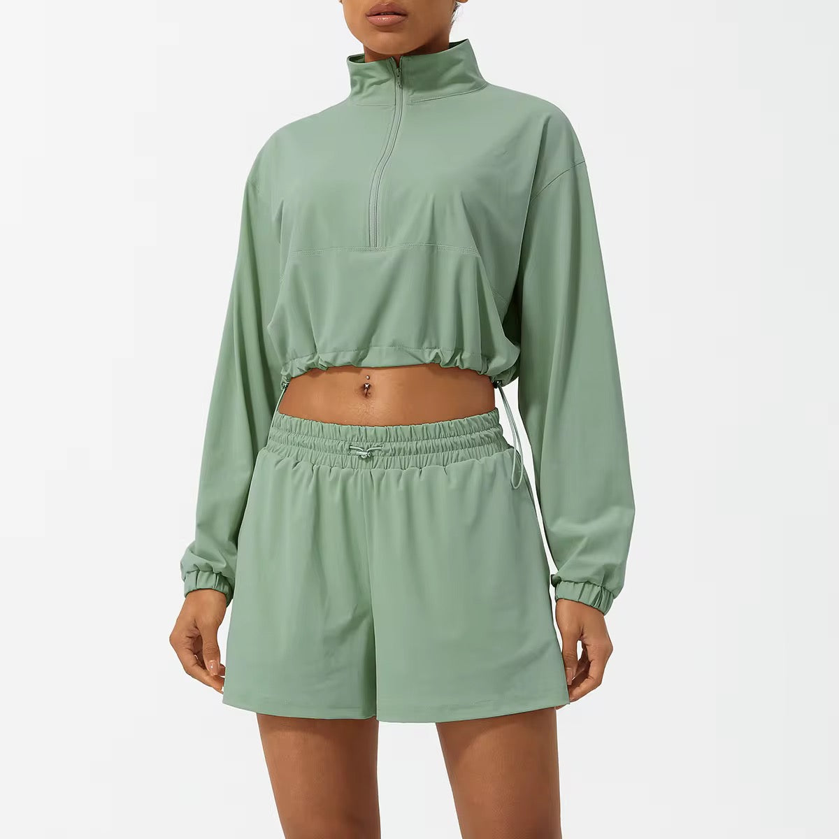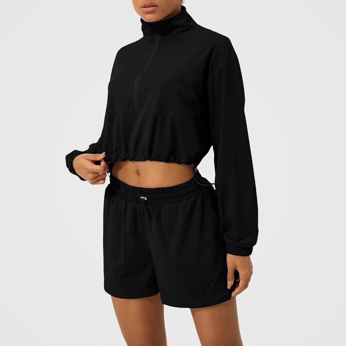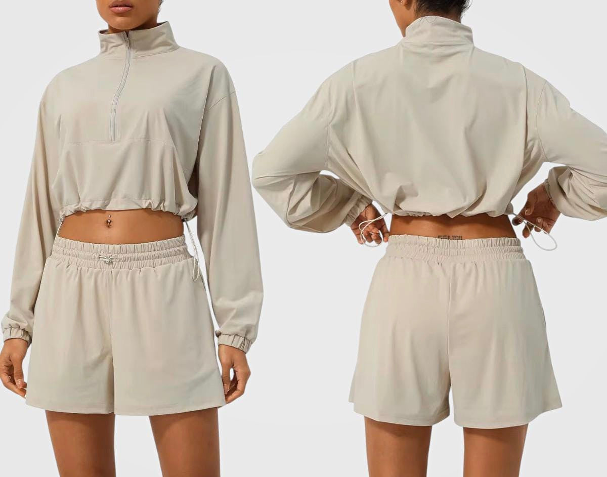 El Set urban incluye una chaqueta de cremallera con cordones ajustables en los laterales y una pantaloneta fresca y cómoda con bolsillos. Perfecto para un look urbano y versátil.